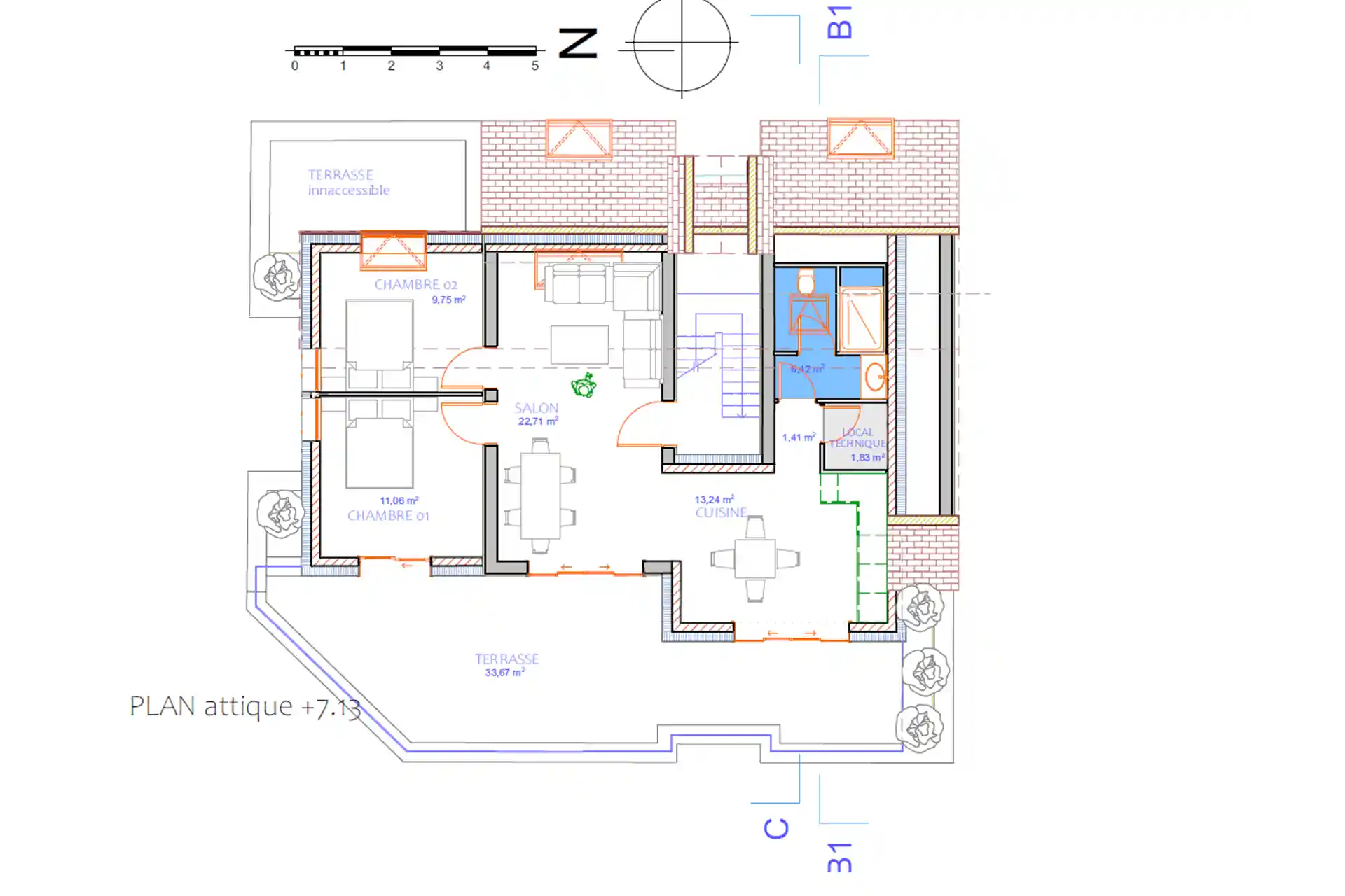Le bâtiment se distingue par un jeu volumétrique raffiné, associant des enduits clairs, du bois naturel et des éléments architecturaux contemporains. Cette composition assure une intégration fine dans l’environnement, tout en offrant des logements lumineux et fonctionnels. L’attique, avec ses généreuses terrasses orientées sud et ouest, couronne l’ensemble et apporte une signature moderne distinctive.