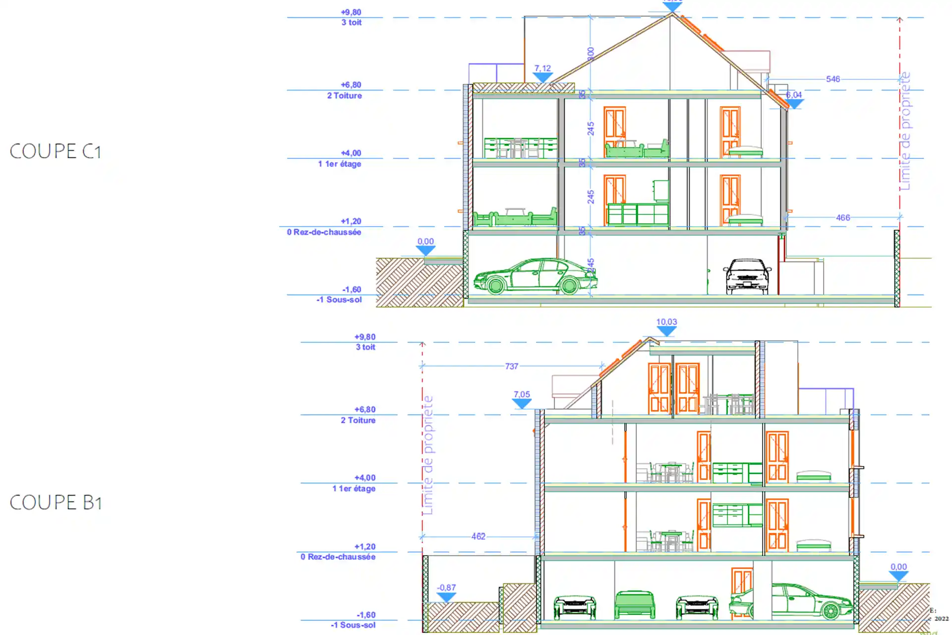 L’architecture de la façade valorise la géométrie du site d’angle avec des retraits subtils, des percements variés et des volumes saillants expressifs. Traitée avec légèreté, la partie attique renforce l’identité contemporaine du bâtiment tout en assurant une transition douce avec le voisinage.